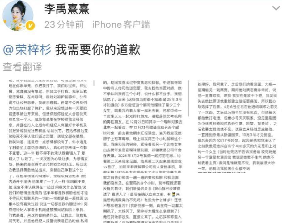 更让人心寒的是这段感情的全过程。两人2024年7月在一起,认识才一个月就确定关系,当时荣梓杉才18岁。李禹熹原以为是个单纯的小男生,结果背地里同时和四个女生保持联系,消息来回切换,玩得挺溜。她自己后来查出了中度焦虑和抑郁症,情绪几近崩溃时,对方却正忙着和其他人约会。每次她想提分手,那边就开始闹,录视频、威胁要查她父母信息,搞得她走也不是,留也不是。